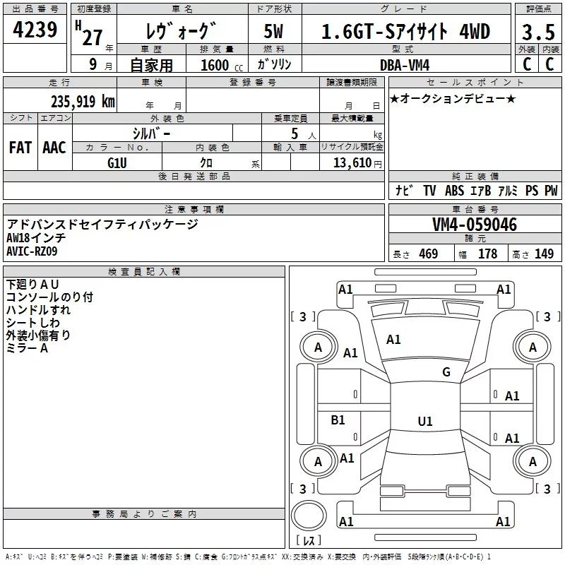 Subaru LEVORG с аукциона Японии TAA Hiroshima лот № 4239