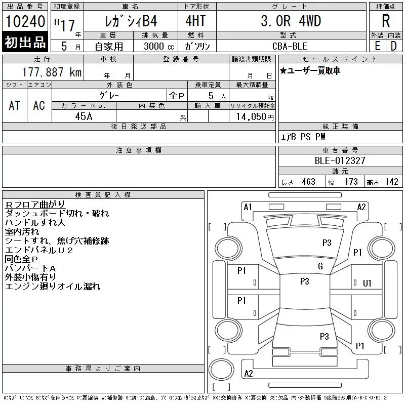 Subaru LEGACY B4 с аукциона Японии CAA Tokyo лот № 10240