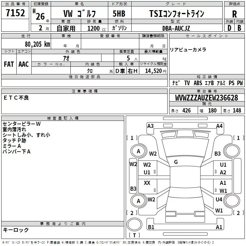 Volkswagen GOLF с аукциона Японии TAA Hiroshima лот № 7152