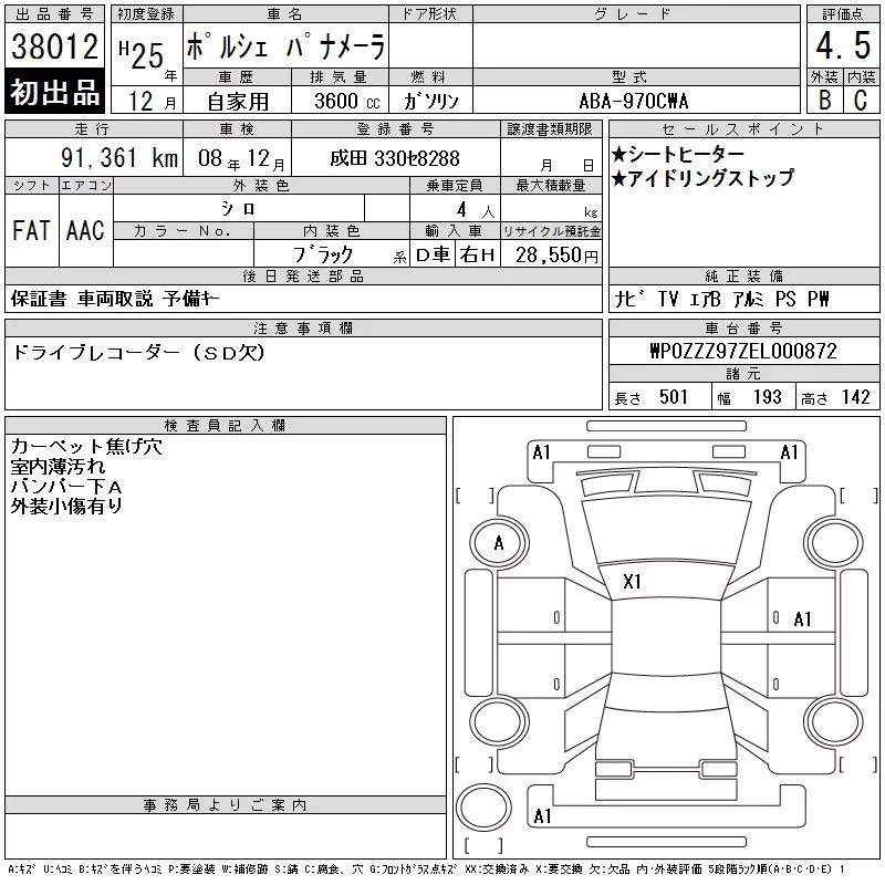 Porsche PANAMERA с аукциона Японии CAA Tokyo лот № 38012