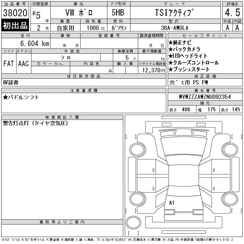 Volkswagen POLO с аукциона Японии CAA Tokyo лот № 38020