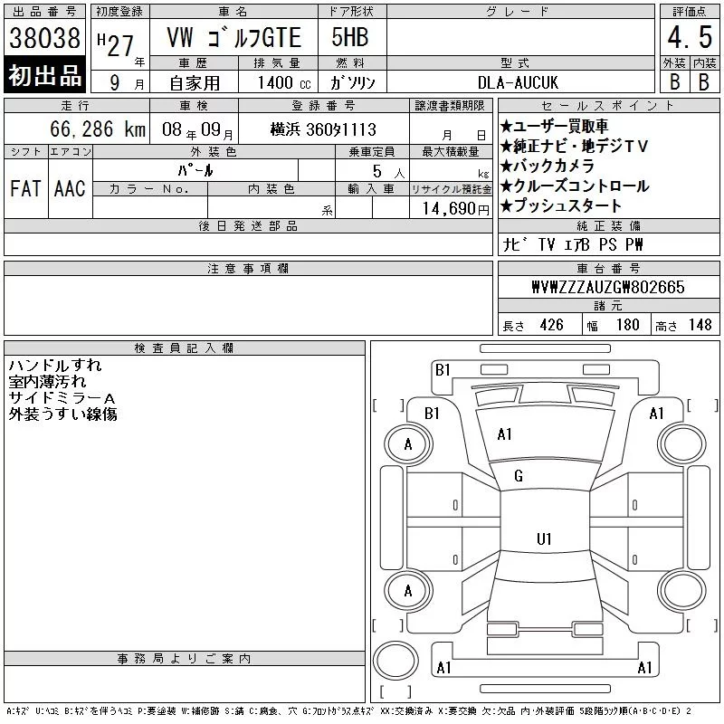 Volkswagen GOLF с аукциона Японии CAA Tokyo лот № 38038