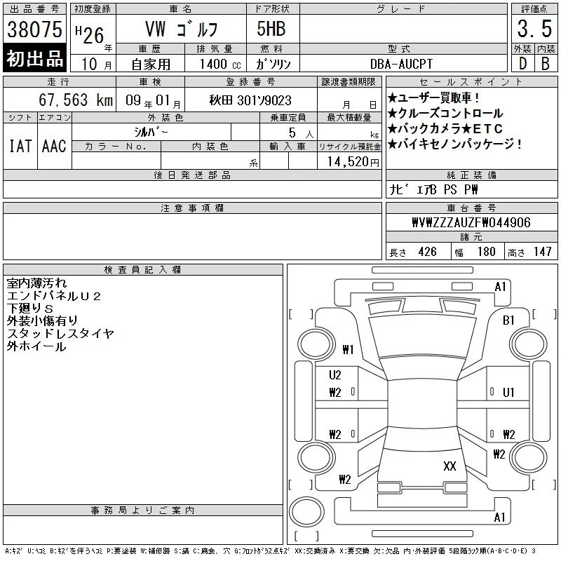 Volkswagen GOLF с аукциона Японии CAA Tokyo лот № 38075