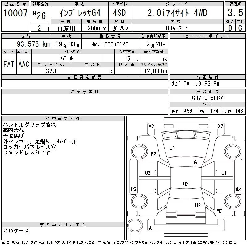 Subaru IMPREZA G4 с аукциона Японии CAA Gifu лот № 10007