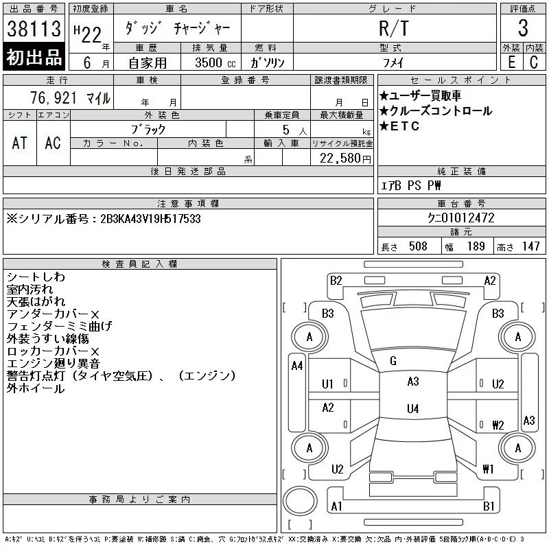 Dodge CHARGER с аукциона Японии CAA Tokyo лот № 38113