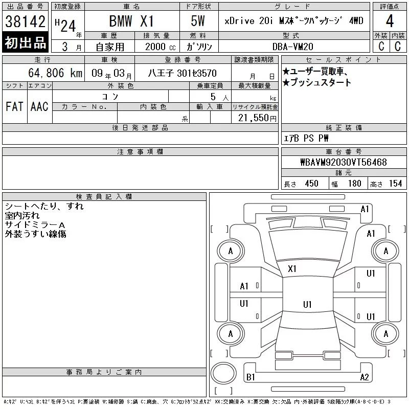BMW X1 с аукциона Японии CAA Tokyo лот № 38142