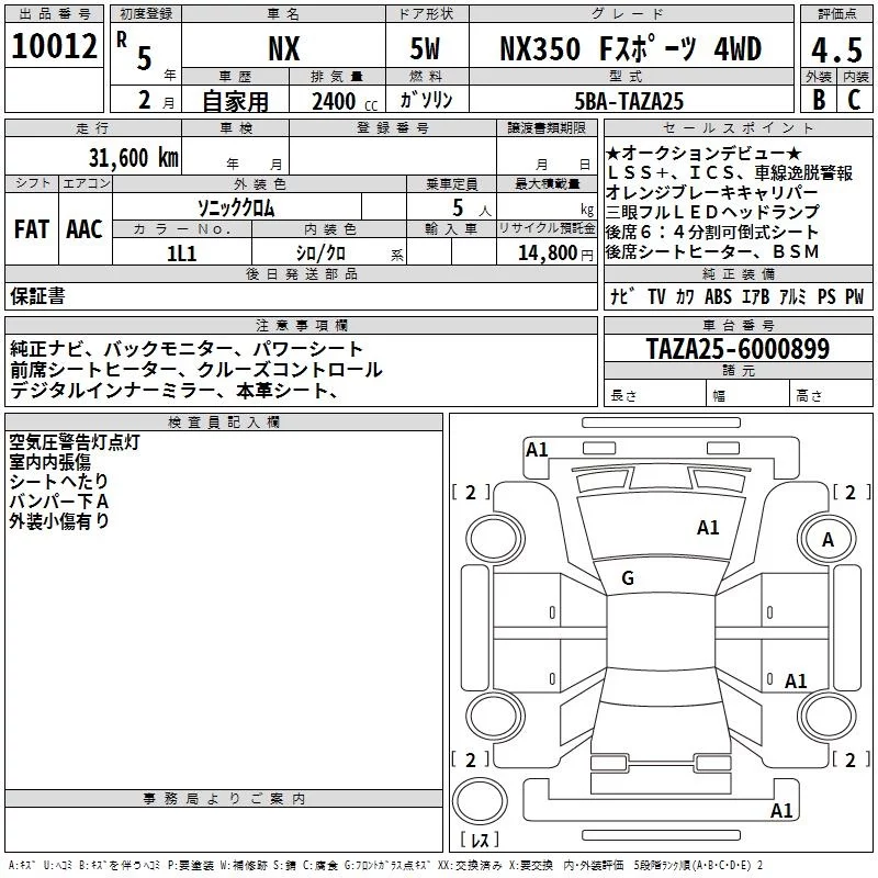Lexus NX с аукциона Японии TAA Kinki лот № 10012