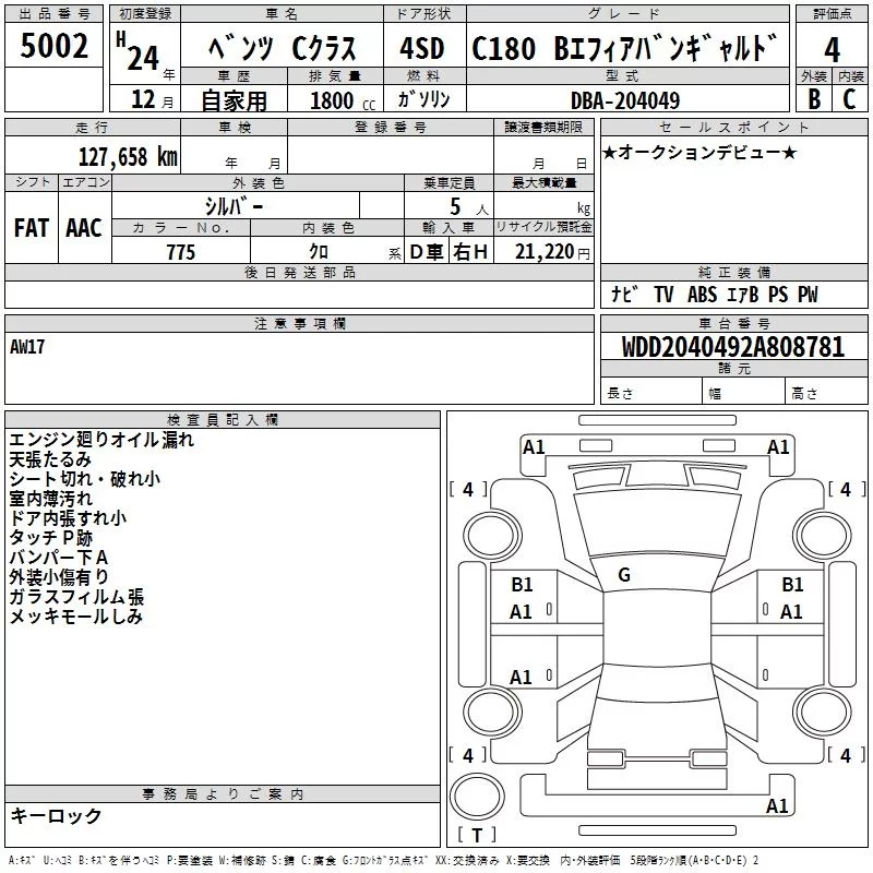 Mercedes-Benz C CLASS с аукциона Японии TAA Hiroshima лот № 5002