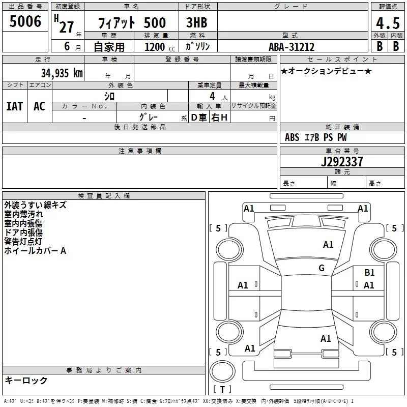 Fiat 500 с аукциона Японии TAA Hiroshima лот № 5006