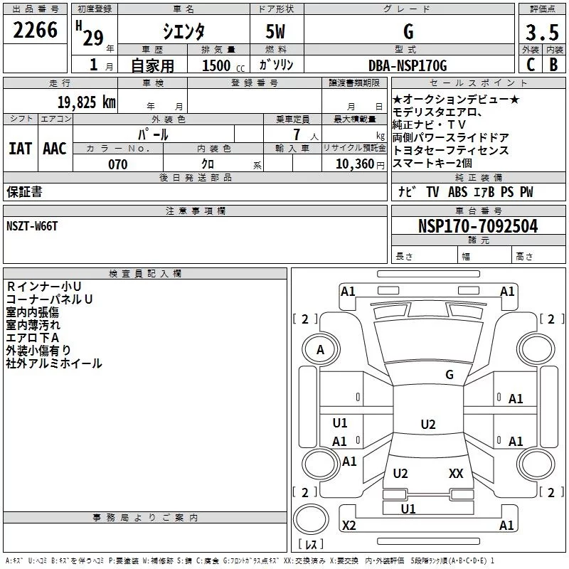 Toyota SIENTA с аукциона Японии TAA Kinki лот № 2266