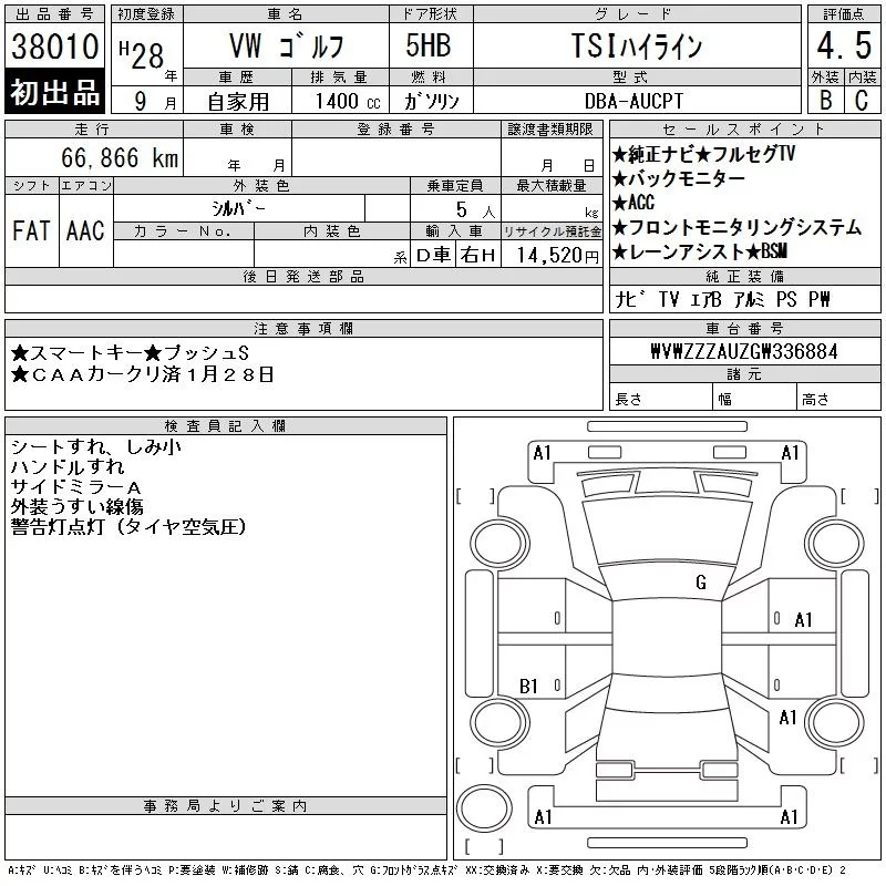 Volkswagen GOLF с аукциона Японии CAA Chubu лот № 38010