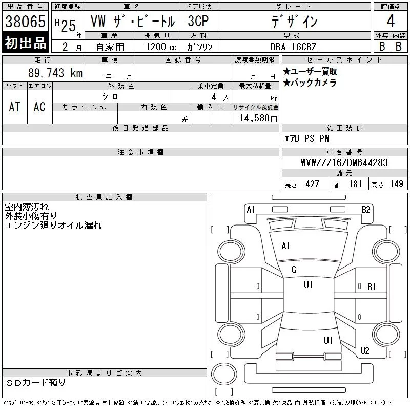 Volkswagen THE BEETLE с аукциона Японии CAA Chubu лот № 38065