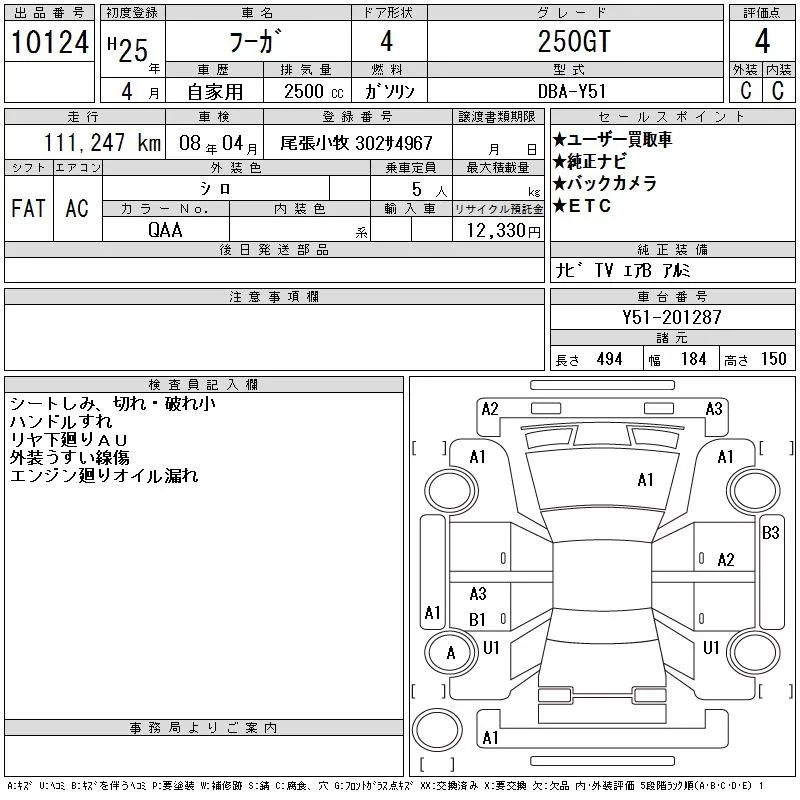 Nissan FUGA с аукциона Японии CAA Chubu лот № 10124
