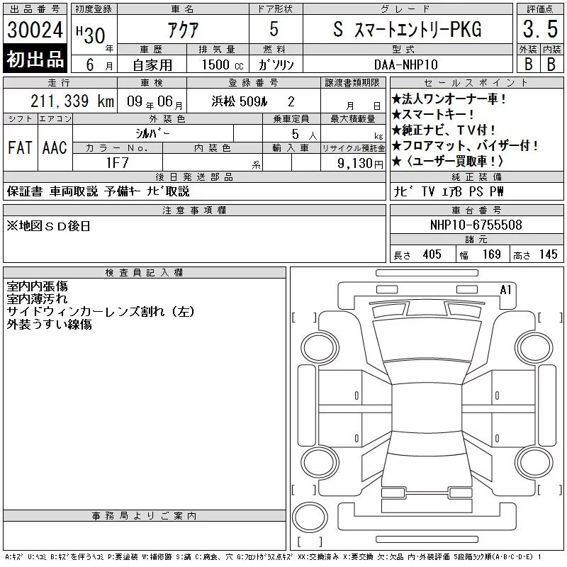 Toyota AQUA с аукциона Японии CAA Chubu лот № 30024