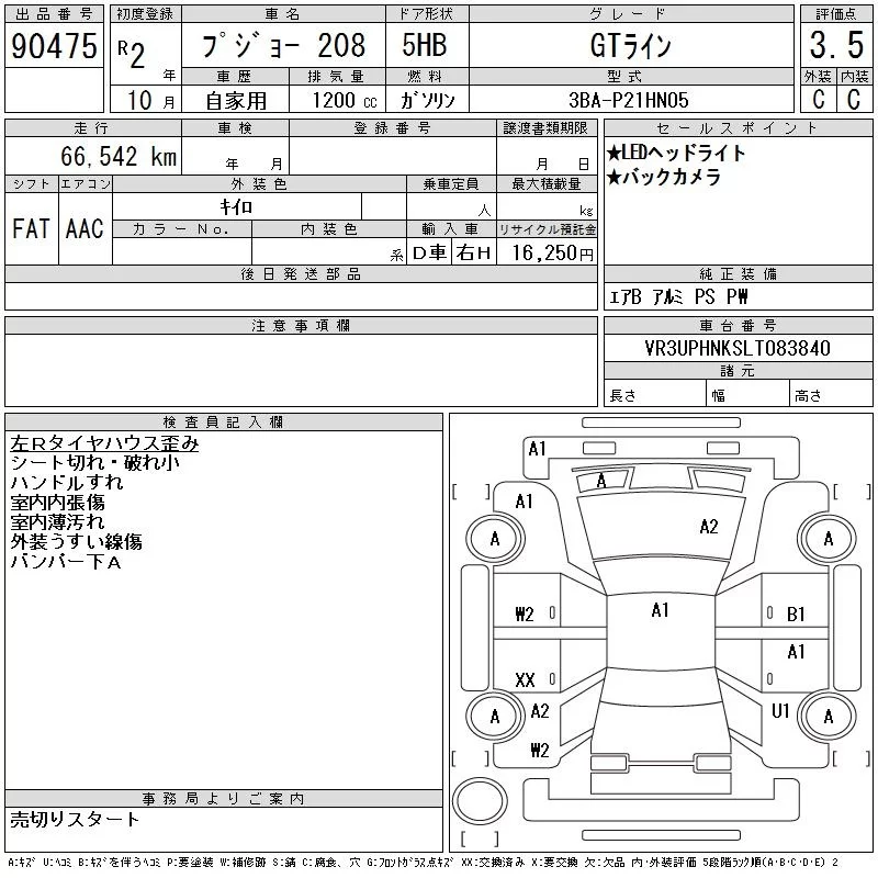 Peugeot 208 с аукциона Японии CAA Chubu лот № 90475