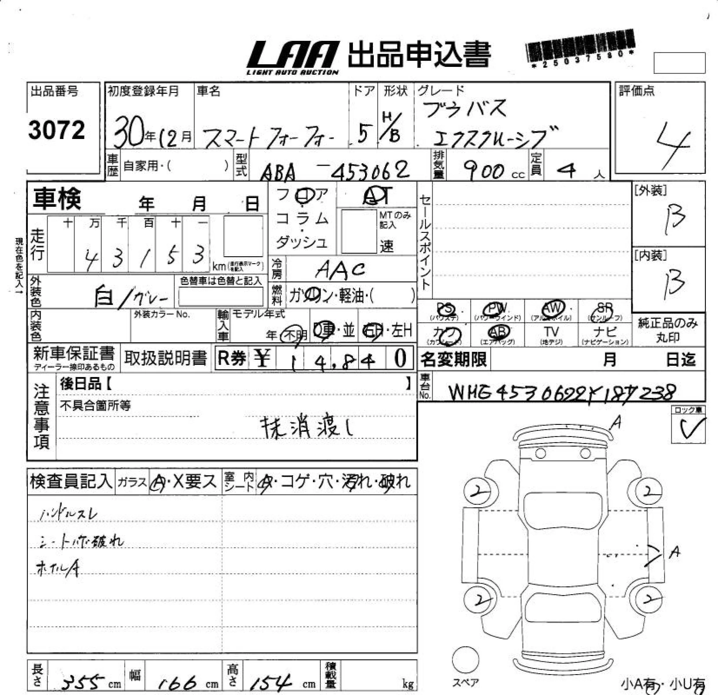 Smart FORFOUR с аукциона Японии LAA Shikoku лот № 3072