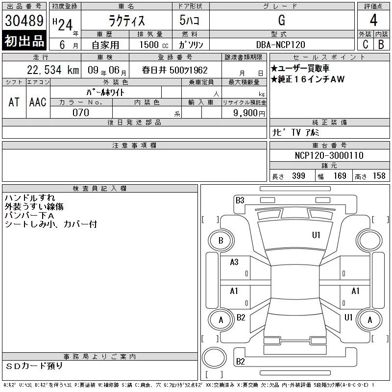Toyota RACTIS с аукциона Японии CAA Chubu лот № 30489