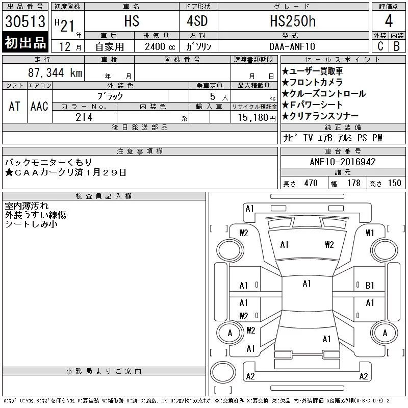 Lexus HS с аукциона Японии CAA Chubu лот № 30513