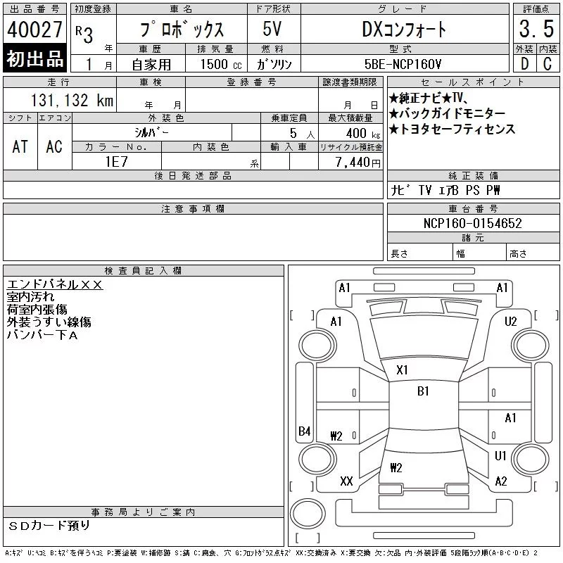 Toyota PROBOX с аукциона Японии CAA Chubu лот № 40027