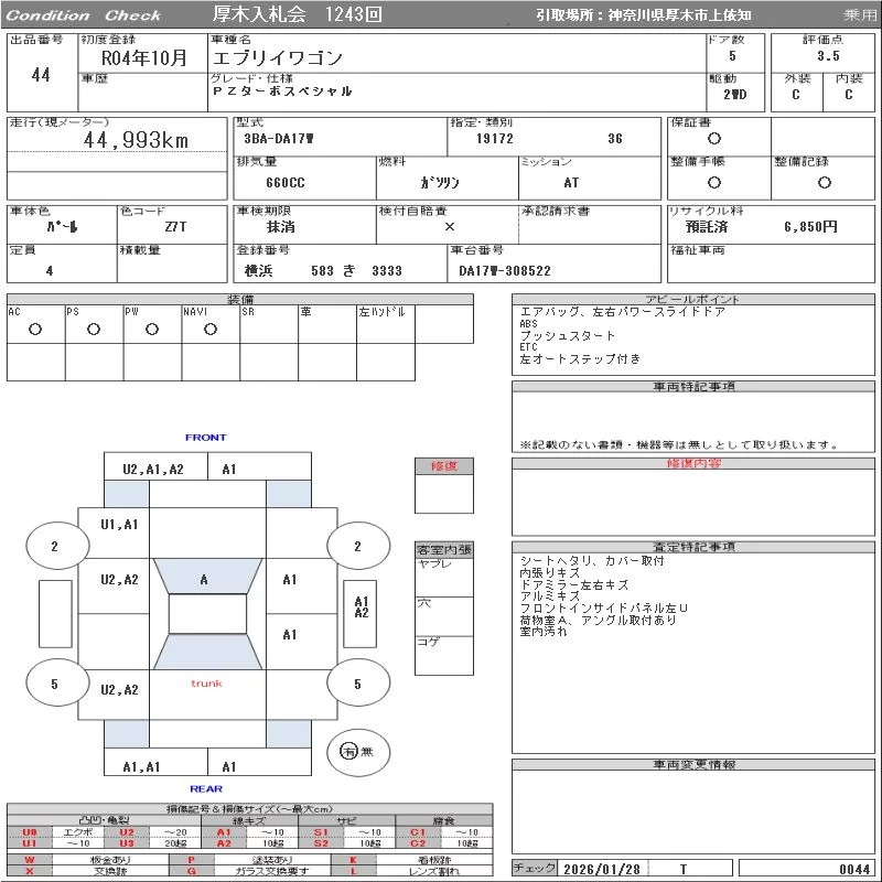 Suzuki EVERY WAGON с аукциона Японии ORIX Atsugi Nyusatsu лот № 44