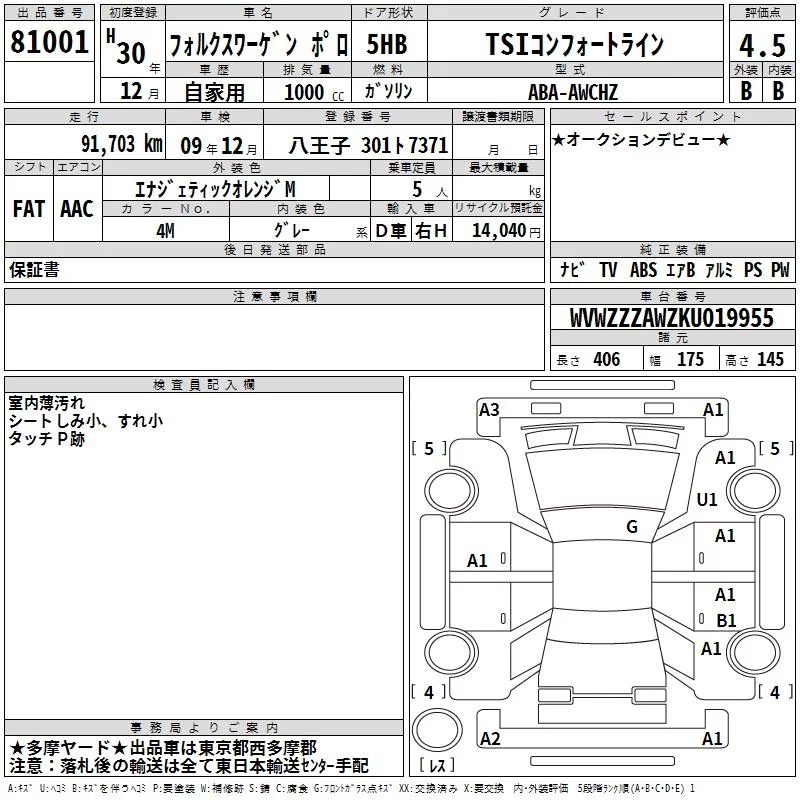 Volkswagen POLO с аукциона Японии TAA Kanto лот № 81001