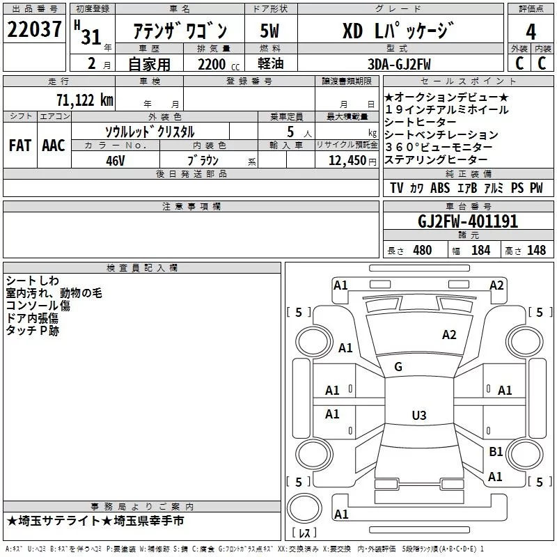 Mazda ATENZA WAGON с аукциона Японии TAA Kanto лот № 22037