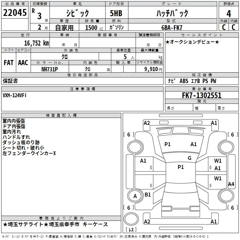 Honda CIVIC с аукциона Японии TAA Kanto лот № 22045