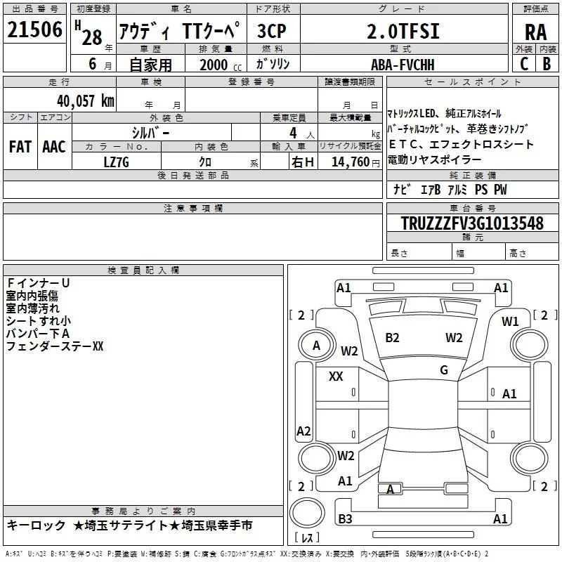 Audi TT с аукциона Японии TAA Kanto лот № 21506