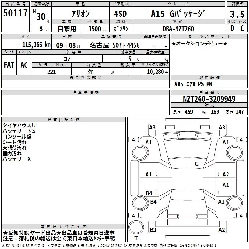 Toyota ALLION с аукциона Японии TAA Chubu лот № 50117