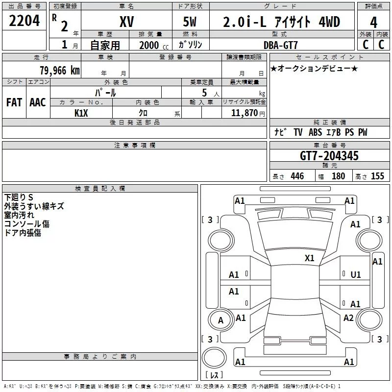 Subaru XV с аукциона Японии TAA Chubu лот № 2204