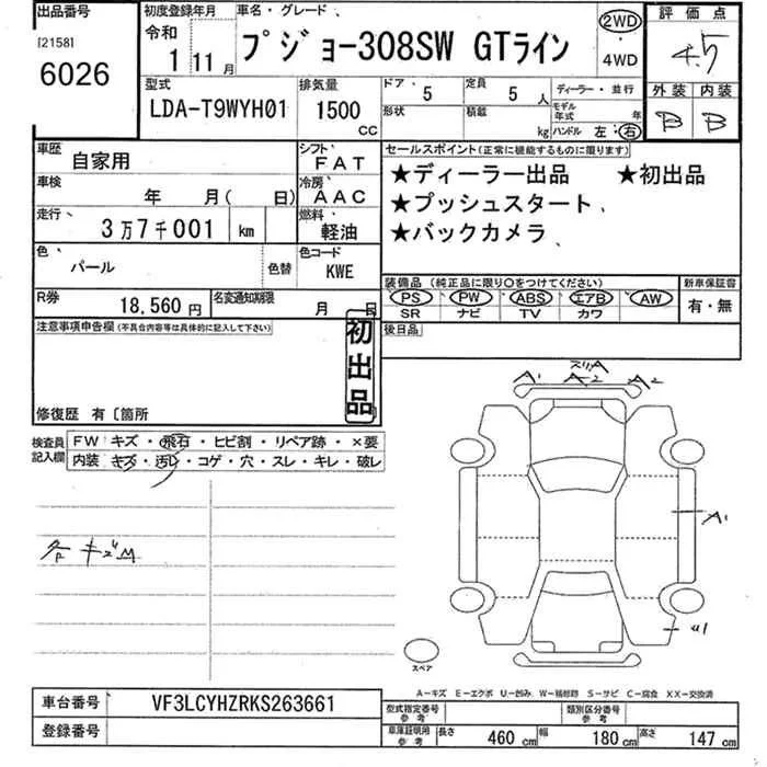 Peugeot 308 с аукциона Японии JU Kanagawa лот № 6026