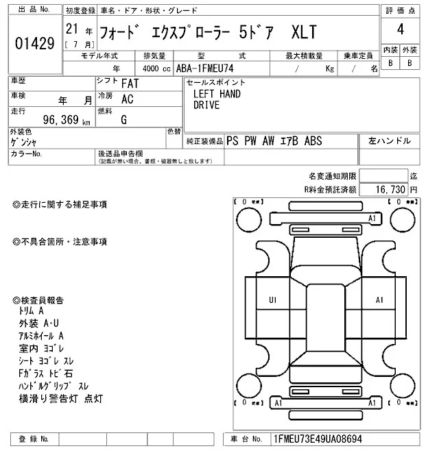 Ford EXPLORER с аукциона Японии ARAI Oyama лот № 1429