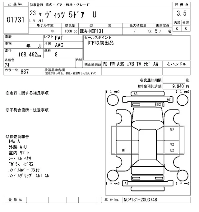 Toyota VITZ с аукциона Японии ARAI Oyama лот № 1731