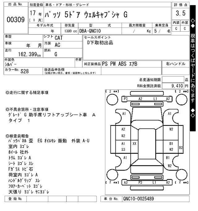 Toyota PASSO с аукциона Японии ARAI Oyama лот № 309
