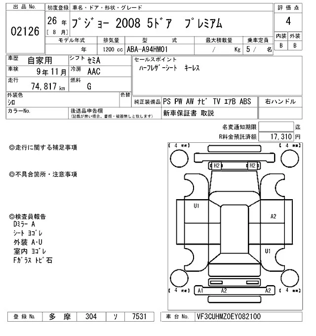 Peugeot 2008 с аукциона Японии ARAI Bayside лот № 2126