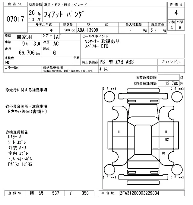 Fiat PANDA с аукциона Японии ARAI Bayside лот № 7017