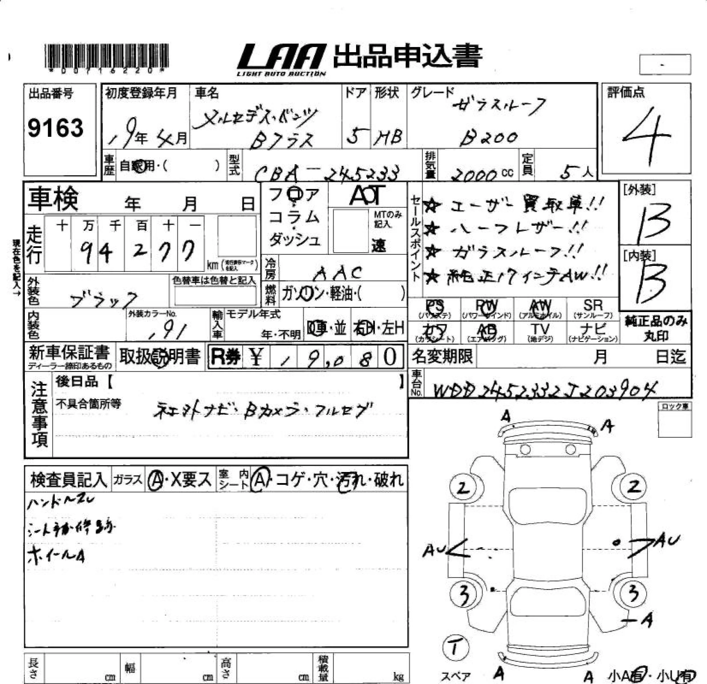 Mercedes-Benz B CLASS с аукциона Японии LAA Okayama лот № 9163
