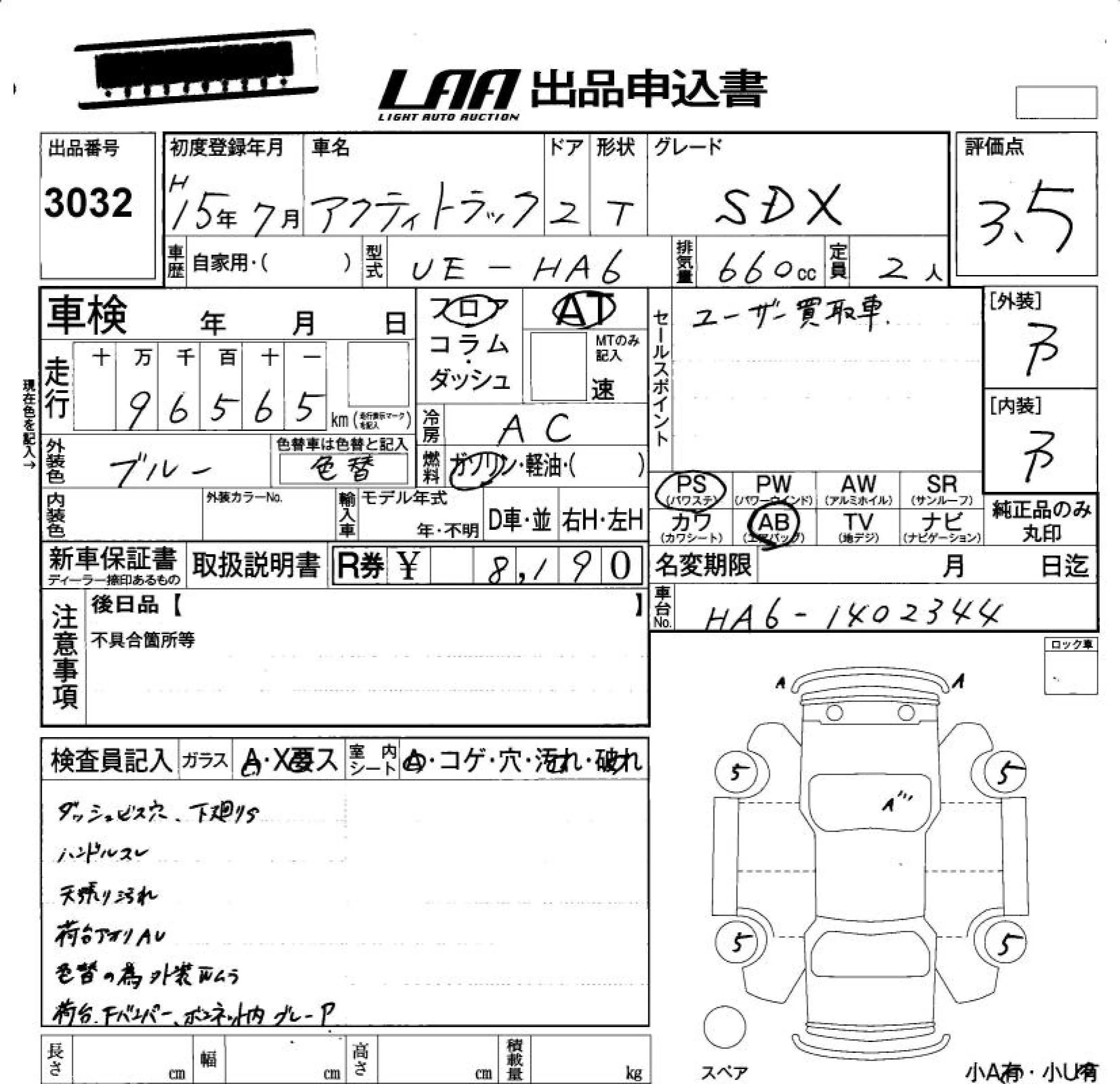 Honda ACTY TRUCK с аукциона Японии LAA Okayama лот № 3032