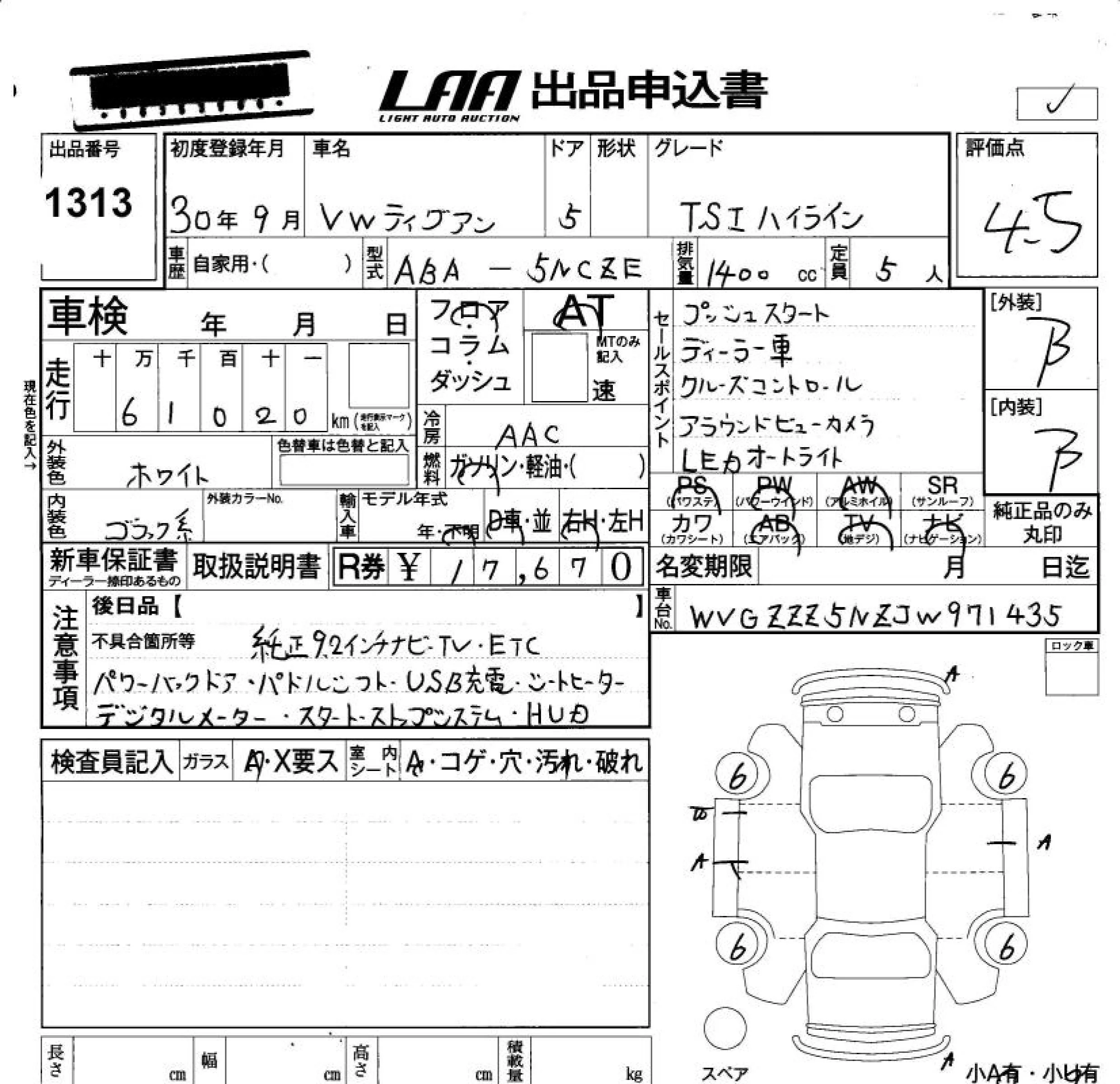Volkswagen TIGUAN с аукциона Японии LAA Okayama лот № 1313