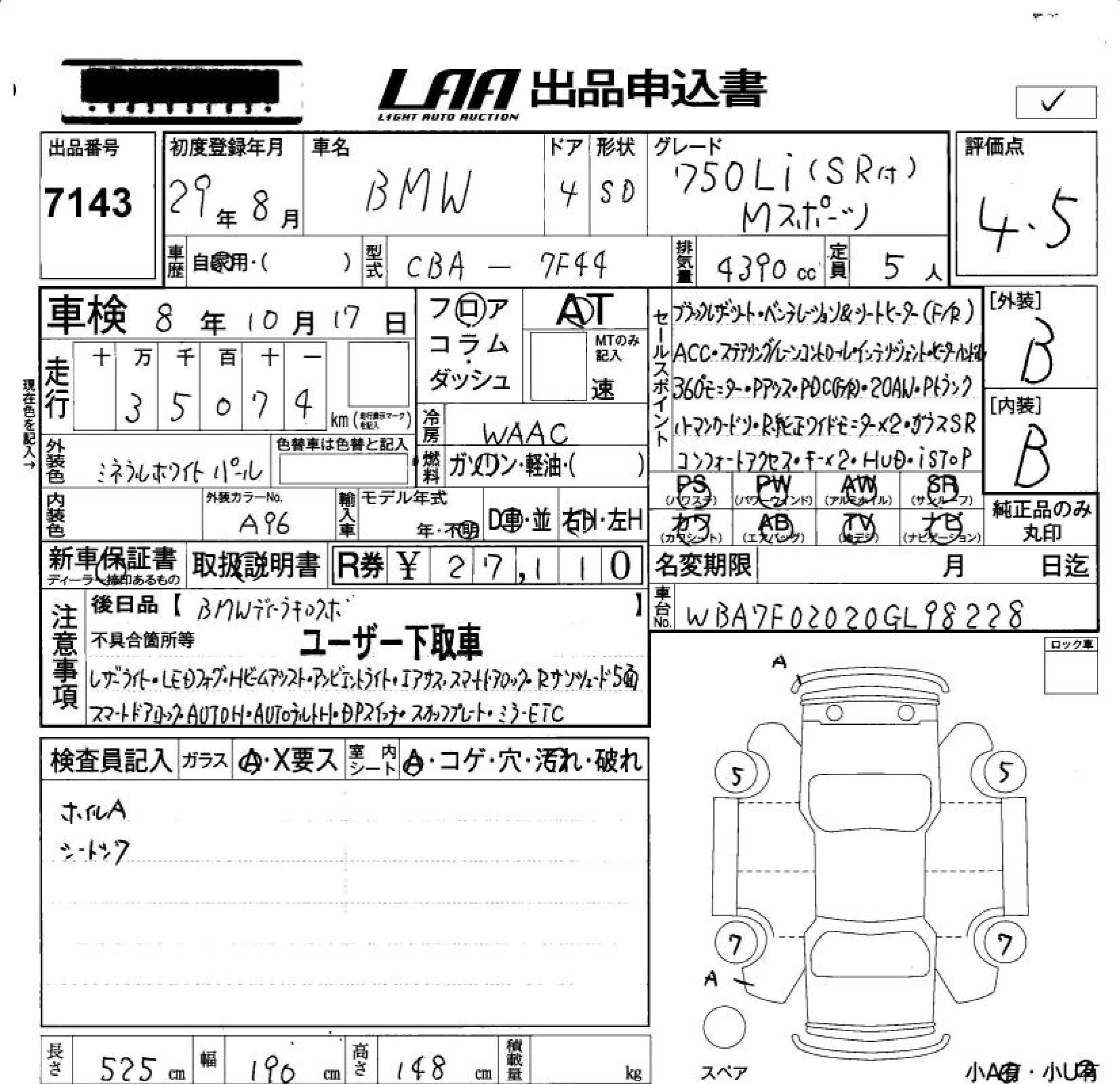 BMW 7-Series с аукциона Японии LAA Okayama лот № 7143