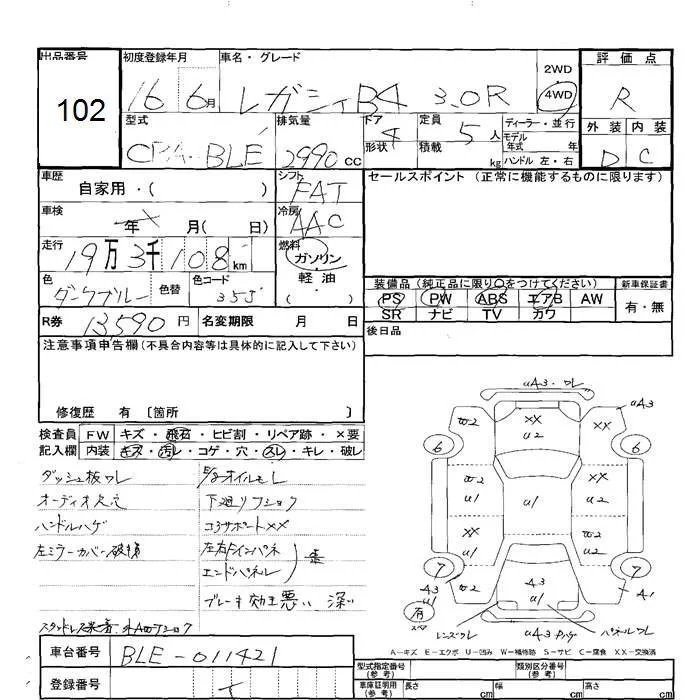 Subaru LEGACY B4 с аукциона Японии JU Hokkaido лот № 102