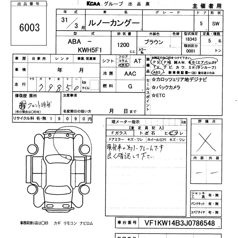 Renault KANGOO с аукциона Японии KCAA Yamaguchi лот № 6003