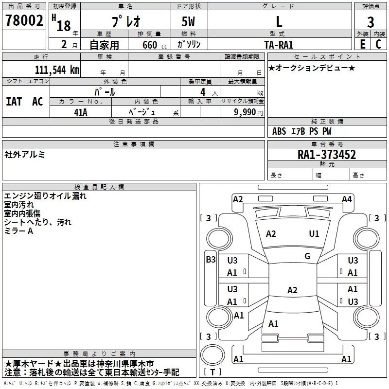 Subaru PLEO с аукциона Японии TAA Yokohama лот № 78002