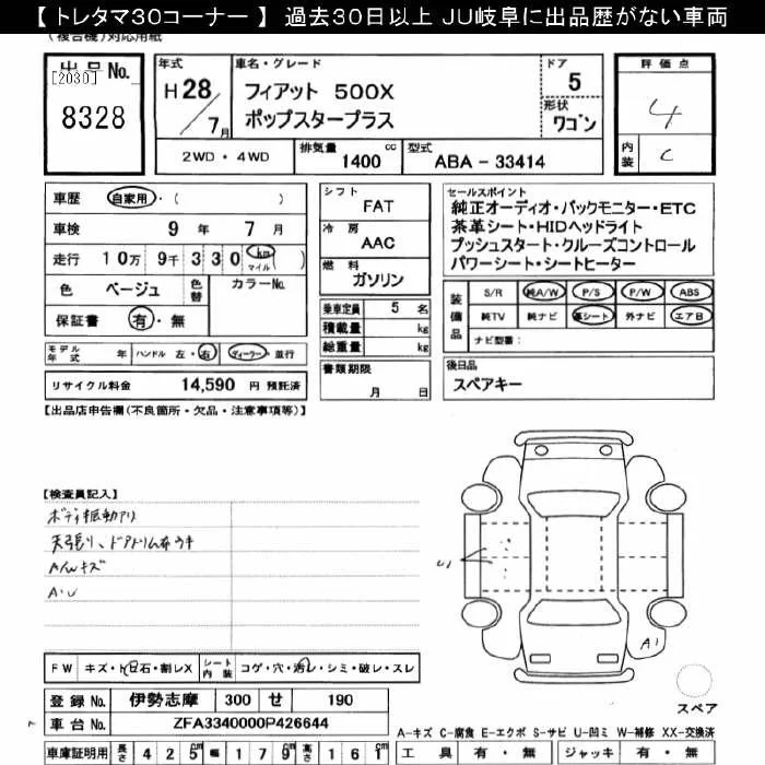 Fiat 500X с аукциона Японии JU Gifu лот № 8328