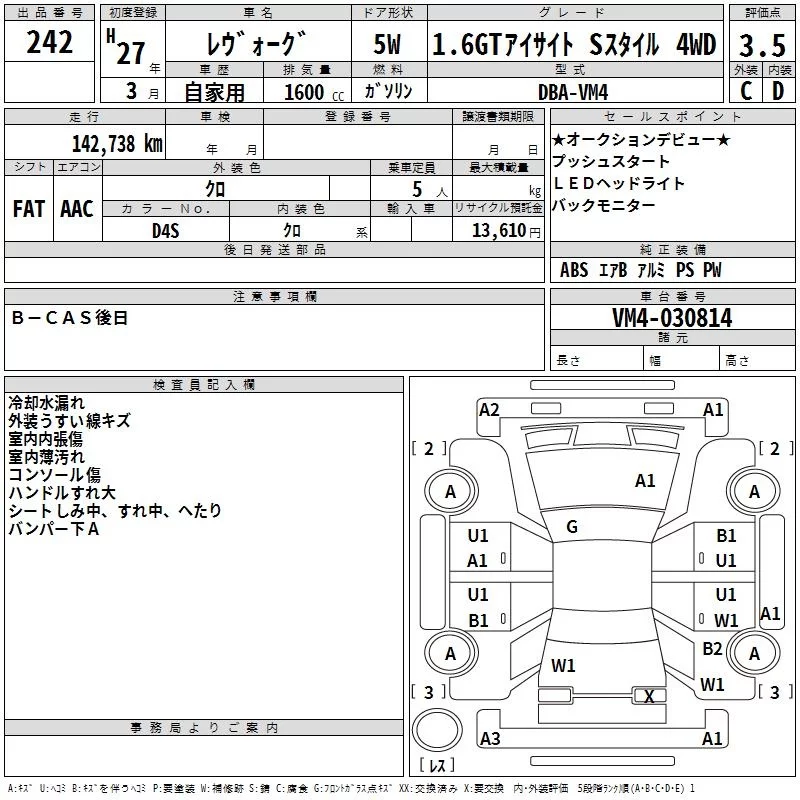 Subaru LEVORG с аукциона Японии TAA Hyogo лот № 242