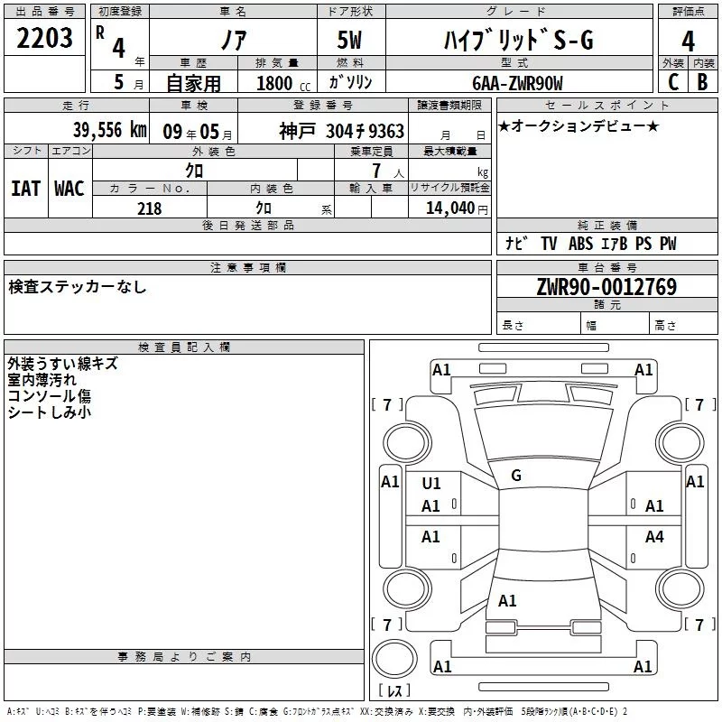Toyota NOAH с аукциона Японии TAA Hyogo лот № 2203