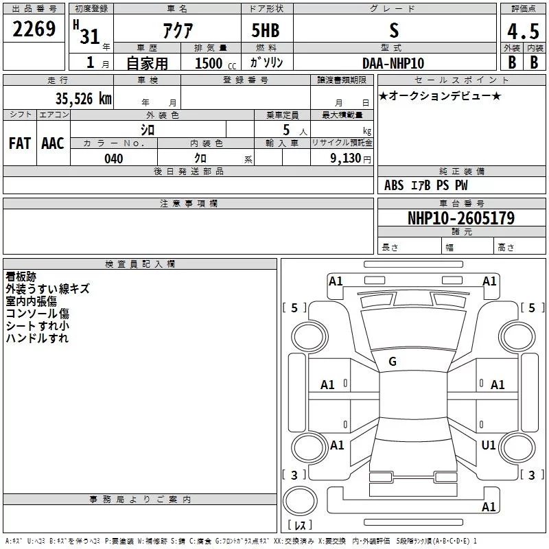 Toyota AQUA с аукциона Японии TAA Hyogo лот № 2269