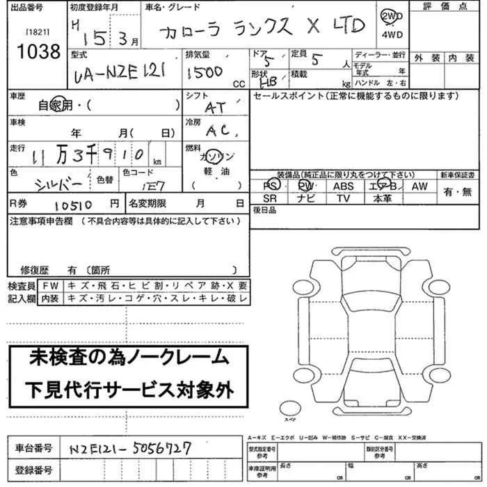 Toyota COROLLA RUNX с аукциона Японии JU Nara лот № 1038