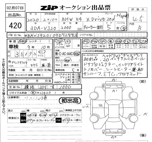 BMW X4 с аукциона Японии ZIP Tokyo лот № 420