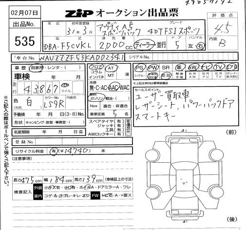 Audi A5 с аукциона Японии ZIP Tokyo лот № 535